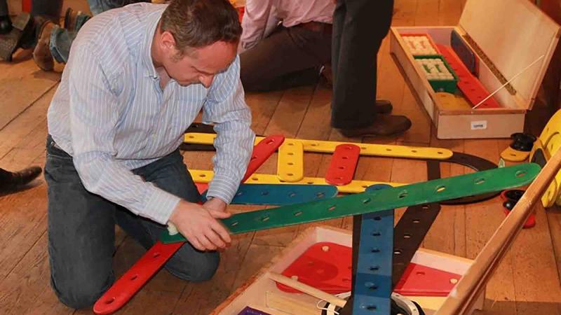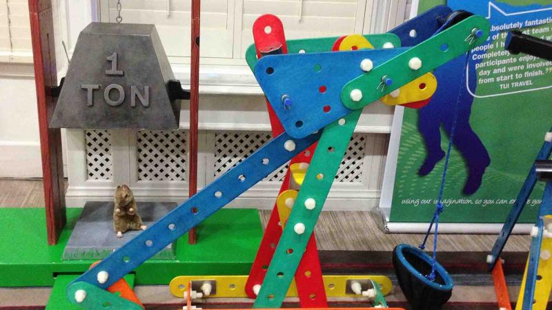 Imagine the atmosphere as your team enters a toy shop full of giant sized construction pieces - a set of metal and plastic components, parts, nuts and bolts, ready to be made into mechanical models! The objective is to build a series of large contraptions which, when placed in the right sequence, perform an amazing chain reaction of events where each device triggers the next in an ingenious way. Execution of every element of a plan needs to be perfect to create a knock on effect to other teams working towards the same goal. If teams get everything right the final piece is triggered, the one ton weight drops and the rat gets it (well not literally).